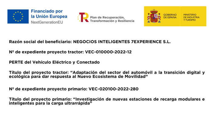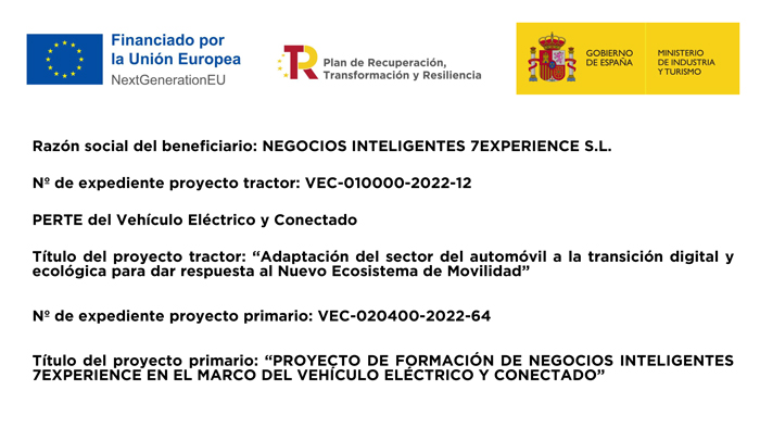 Negocios Inteligentes 7Experience SL ha recibido una ayuda de 750€ para MOVES III vehiculo eléctrico de la Unión Europea con cargo al Fondo NextGenerationEU, en el marco del Plan de Recuperación, Trasformación y Resiliencia, para la adquisición de vehículos eléctricos “enchufables” y de pila combustible dentro del Programa de incentivos a la movilidad eficiente y sostenible (Programa MOVES III Vehículos Comunitat Valenciana) del Ministerio para la Transición Ecológica y el Reto Demográfico a través del IDAE, gestionado por el Instituto Valenciano de Competitividad Empresarial (IVACE).